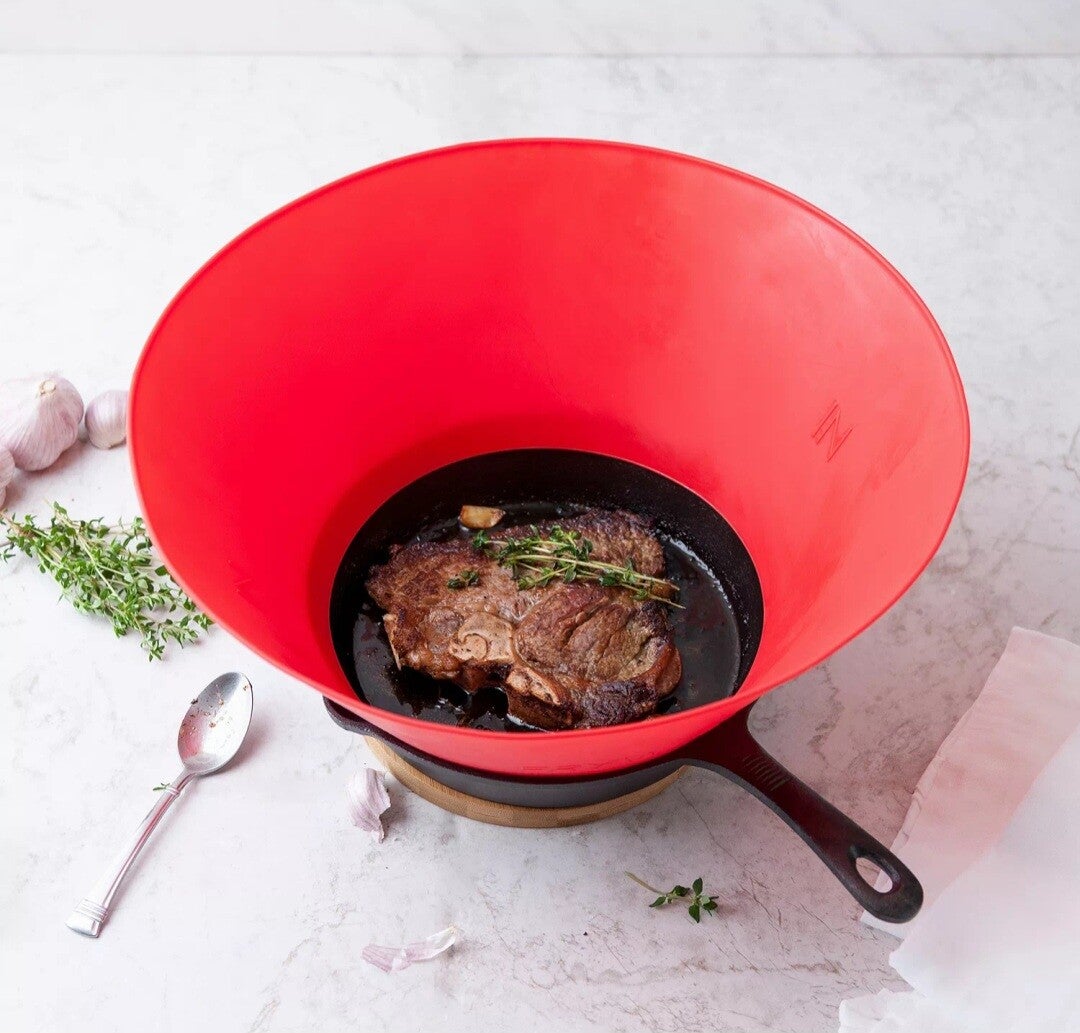 A flexible silicone guard that keeps stovetops clean while allowing stirring access.